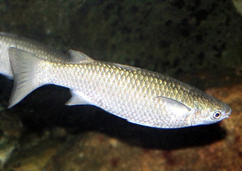 | ワニグチボラは東シナ海から南シナ海を経てサンゴ海などの西太平洋に分布しているボラの仲間で、紅海を含むインド洋にも分布している。 国内では日本海側でも稀に見られるが、千葉辺りより南に分布していて、成魚の多くは沖縄地方などで見られる。 体は細長くて側扁しているが、頭部背面は平たくて、わずかに縦扁している。 体色は、腹側は銀白色をしているが、背側はオリーブ色を帯びていて、胸びれ基底の上端には暗色の斑が見られる。 ボラとはよく似ているが、ワニグチボラの方が体高が高いほか、眼を被う脂瞼がボラのように発達せず、ボラに見られる胸びれ基底の青い斑はない。 また、コボラにも似ているが、コボラの胸びれ基底には金色の斑がある。 ワニグチボラは沿岸の浅い岩礁域や珊瑚礁域などに生息していて、主に表層辺りを遊泳している。 群れでいることが多く、ボラのようにデトリタスや藻類、甲殻類や多毛類などを食べる。 国内では幼魚が多く、利用されることは少ないが、国外では食用として利用されている他、マグロ漁などの餌にも利用されている。 ボラ科の魚類へ / このページの先頭へ |