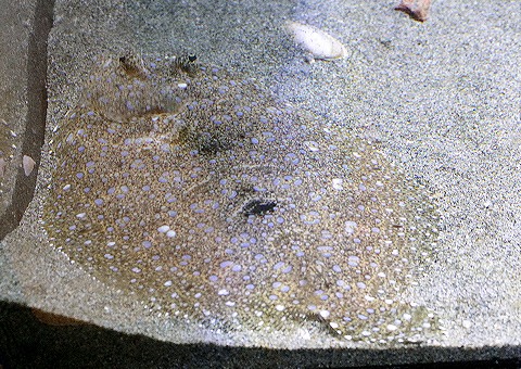 | トゲダルマガレイは、日本を含む西太平洋のほか、ハワイ諸島やライン諸島などの中部太平洋にも分布しているダルマガレイの仲間で、国内では和歌山辺りから南で見られる。 また、紅海を含むインド洋にも分布していて、アフリカ東海岸からアラビア海、ベンガル湾、オーストラリア西海岸まで、広く分布している。 体は卵円形で、著しく扁平している。 吻は丸く、尾びれはひし形のような形をしている。 眼は突出していて、大きな個体では眼の周りに数本の皮弁が見られ、これが和名(トゲ)の由来となっている。 また、「カレイ」と名前についているが、他のダルマガレイと同様、眼は左側についている。 大きいものは40cm程に成長するが、雄の有眼側の胸びれは著しく伸長し、尾柄近くまで達するものも見られ、雄は雌より眼隔幅が広い。 体色は、有眼側は淡い茶褐色のような色合いで不規則なまだら模様があるが、側線の直走部分には、目に付く黒っぽい斑がある。 また、体色や斑は周りの色に溶け込むように変化させることができ、保護色の役目を果たしている。 モンダルマガレイとは似ているが、トゲダルマガレイの吻の背面はくぼまず、眼も大きい。 底性の魚で、サンゴ礁域や岩礁域の砂底や砂泥底などに生息していて、小魚や底生動物などを食べる。 水深150m辺りまで見られるが、幼魚は潮溜まりなどでも見られる。 この他、トゲダルマガレイは他の魚と共に定置網や刺し網、釣りなどで漁獲され、食用に利用されている。 煮付けなどのほか、加工原料などにも用いられている。 カレイ目の魚類へ / このページの先頭へ |