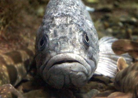 | クロソイは日本各地や朝鮮半島沿岸、中国北部などに分布しているメバルの仲間で、大きいものでは全長が60cm、体重は3kg程になるものも見られる。 鱗は櫛鱗で、体は楕円形で側扁している。 名前のように、体色は暗い灰褐色で、体側には不明瞭な黒褐色や黒色などの横帯が4~5本程度見られる。 頭部の棘は短いが丈夫で、尾びれの後縁は丸みを帯び、上下の端は白っぽい。 タケノコメバルやキツネメバルなどに似ているが、クロソイには眼と唇の間(涙骨)に3本のはっきりとした棘があり、鰓蓋の棘も鋭い。 シマソイにも似た感じがするが、クロソイにはシマソイに見られる縦縞はない。 国内では北日本に多く、水深が100m位までの沿岸の岩礁域に生息している。 底性の魚で、小魚や甲殻類、頭足類などを食べる。 また、クロソイは卵胎生で、日本近海では5~6月頃に7~10mm程度の胎仔を産むが、この頃は浅場に多く、秋には深場に多い。 寿命は、自然下で10年程度と言われている。 クロソイは、刺し網や定置網などで漁獲され食用に利用されるが、白身の魚で美味しいものとされ、塩焼きや鍋物などに利用される。 また、釣りの対象魚にもなっていて、船釣りなどが行われている。 尚、メバルの仲間はカサゴ目・フサカサゴ科に分類されているが、メバル科を新設して、スズキ目・メバル科として扱われることもある。 フサカサゴ科の魚類へ / このページの先頭へ |