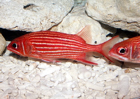 | テリエビスはインド洋や太平洋などに分布しているキンメダイ目の海水魚で、太平洋では、西太平洋のほかハワイ諸島やライン諸島などの中部太平洋にも分布している。 国内では本州中部辺りより南の南日本に分布しているが、テリエビスはインド洋にも広く分布していて、紅海でも見られる。 体はやや長くて側扁し、頭部は小さい。 また、頭部の背縁は眼の上で隆起していて口は小さい。 主鰓蓋骨の後方には2本の棘があり、前鰓蓋骨の後下には1本の大きな棘が見られ、後方に向かって伸びている。 しりびりの第三棘は強大で、鱗は小さくて硬い。 体色は赤色で、体側には白色の細い縦縞が多数見られる。 また、背びれ棘条の鰭膜にも1本の白色の縦帯がある。 一見してイットウダイによく似ているが、テリエビスには、背びれ棘条前部に暗色の斑が見られ、しりびれの棘も大きい。 アヤメエビスとも似ているが、テリエビスの背びれやしりびれの基底付近には、暗色の斑などが見られない。 側線有孔鱗数もアヤメエビスの34~37に対して、テリエビスは46~49と多くなっている。 沿岸の岩礁域やサンゴ礁域などに群れで生息し、主にカニやエビなどの甲殻類を食べる。 水深5~70m位のところに見られるが、主として夜行性で、日中は岩陰や岩の割れ目などに潜んでいることが多い。 テリエビスは流通することはほとんどないが、刺し網や釣りなどで獲られ、食用に利用されることがある。 白身の魚で、刺身や煮付け、焼き物などに利用され、美味しいものとされている。 イットウダイ科の魚類へ / このページの先頭へ |