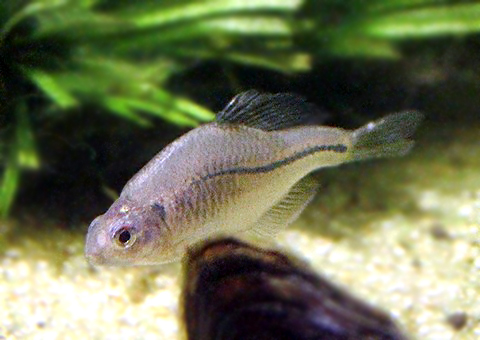 | スイゲンゼニタナゴは兵庫県の千種川から広島県芦田川にかけての山陽地方だけに自然分布しているが、朝鮮半島西南部に分布するものも亜種とされている。 水の澄んだ平野部の河川の中・下流域や、本流とつながる灌漑用水路などに生息し、流れの緩やかな砂泥底や砂礫底のところを好む。 もっとも小型のタナゴ類で、体長は普通3cm程度、体は著しく側扁している。 側線は不完全で、体側には鰓ぶたの後ろ辺りからはじまる、はっきりとした青色の縦帯がある。 口ひげはなく、背びれと腹びれの縁も朱色の縁取りが見られ、小さいながら全体に大変きれいな魚である。 亜種であるカゼトゲタナゴに大変よく似ているが、これに比べて、スイゲンゼニタナゴでは吻端が丸くて、体高が高い。 しかし、一見しただけで両種を見分けるのはかなり難しく、分布域が重なっていれば(カゼトゲタナゴは九州北部に分布)、更に判別が困難だと思われる。 また、スイゲンゼニタナゴは(ニッポン)バラタナゴやタイリクバラタナゴにも似ているが、これらとは体の大きさや体側に見られる青い縦帯の始まる位置などによって見分けることが出来る。 産卵期は3~7月で、ほかのタナゴの仲間のように、卵はイシガイやマツカサガイなどの二枚貝の鰓へ産み付けられる。 この時期の雄は、バラタナゴに似たきれいな婚姻色を表し、雌は成熟すると2~4cmの産卵管が伸びる。 ふ化した稚魚は20日程の後に貝の外に出てくる。 また、幼魚の背びれには明瞭な黒斑があり、一年程で成熟し、成魚はユスリカの幼虫や藻類などを食べる。 スイゲンゼニタナゴは山陽地方の狭い範囲だけに分布しているが、近年は岡山県以外の場所からはほとんど見られなくなってしまっている。 元来の自然分布域が限られているだけでなく、河川や用水路などの整備、それに伴う産卵のための二枚貝の減少などによって、生息数は極めて少なくなっている。 現在は環境省のレッドリストに絶滅危惧種・ⅠA類として指定されているが、国内希少野生動植物種にも指定され、大切に保護されている。 名前の由来は、朝鮮半島のものが最初に見つかった韓国の地名である「水原(スイゲン)」からつけられている。 コイ科の魚類へ / このページの先頭へ |