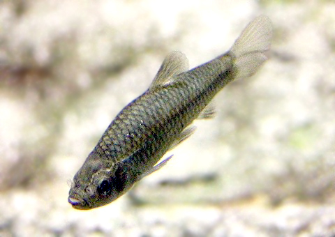 | ウシモツゴは三重、愛知、岐阜などの濃尾平野に自然分布しているコイ科の淡水魚で、静岡や長野などにも分布していると言われている。 体は紡錘形で細く、やや側扁している。 口は吻端にあり、小さくてやや上を向いている。 また、上顎よりも下顎が長く、口ひげはない。 側線は不完全で、胸びれ上方までしか見られないが、鱗は大きい。 体色は黄褐色のような感じで、体側に斑などはなく、体は雄の方が大きい。 一見してモツゴに似ているが、モツゴ程は大きくならず、側線が不完全であるので見分けることができる。 また、シナイモツゴにはよく似ているが、ウシモツゴは雌雄共にモツゴやシナイモツゴに見られる比較的はっきりとした暗色の縦帯は見られない。 縦帯は幼漁期では現れることもあるが、成魚ではほとんど消失してしまう。 また、ウシモツゴの体高はモツゴの中ではもっとも高い。 水草の多い泥底のような底質を好み、平野部の水田や水路、ため池や池など、水の流れのないような所に生息している。 モツゴよりは深場に多く、低層で木の枝の間などに隠れていることが多く、付着藻類や動物プランクトン、底性動物などを食べる。 産卵期は3月下旬~7月上旬頃で、この時期の雄は全体に黒っぽくなり、追星が現れる。 雄は石などの周りに縄張りをつくり、雌を誘って産卵させる。 卵は一週間程で孵化するが、孵化までは雄が卵を守る習性がある。 また、ウシモツゴはケンカモツゴなどとも呼ばれるが、産卵期の雄は激しく縄張り争いを行い、水槽内などでは相手を殺してしまうこともある。 その反面、人影などに驚くと石の間や倒木の枝の間などに素早く隠れてしまう習性がある。 時には泥の中に潜ったりするが、この行動はモツゴとは大きく異なっている。 ウシモツゴは日本の固有種だが、近年では、河川改修や開発などによって生息環境が失われているほか、外来種の圧迫などもあって、生息数はかなり減少している。 現在、環境省のレッドリストでは絶滅危惧種(ⅠA類)に指定しているが、自治体によっては天然記念物にも指定される状況になってしまっていて、更なる保護が必要と言われている。 ところで、ウシモツゴは最近までシナイモツゴの亜種(Pseudorasbora pumila subsp)と考えられていたが、側線鱗数やDNAなどの遺伝的違いによって別種であることが確認されている。 尚、学名の「pugnax」は「攻撃的で気性が荒い」というような意味で、ウシモツゴに見られる性質から付けられている。 コイ科の魚類へ / このページの先頭へ |