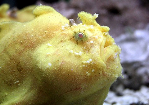 | カエルアンコウは、北緯43度辺りから南緯50度辺りにかけての世界の温帯から熱帯の海域に広く分布していて、特に大西洋や西太平洋に多く見られる。 国内では本州中部辺りから南に分布しているが、太平洋ではハワイ諸島などの中部太平洋でも見られる。 また、紅海を含むインド洋にも分布している。 分布域が広いこともあって、体色や形態の変化が大きく、近年では同種とされているものも、以前は何種類かに別けられていた。 体は卵型で、眼は極めて小さいが、口は大きく、斜め上に開いている。 体には小さな棘や皮弁が密生していて、この内、吻上にあるものはふつう長い触手となっている。 第一背びれは三本に分かれているが、体全体は海底の岩などのように見える。 体色は変化が大きく、白色やオレンジ色、赤色や黄色のもの、斑や縞模様があるものなど、実に様々だが、黄色から灰褐色のものが多い。 また、第二背びれやしりびれ、尾びれには、暗色の斑が散在している。 水深10~40m位までの浅い岩礁域などに生息しているが、時に水深200m程のところでも見られる。 底性で砂泥底に多く見られるが、遊泳はほとんどしない。 しかし、胸びれの筋肉はよく発達していて、これを前足のように使って海底を移動することができる。 動かずにじっとしていることが多く、獲物をとるときは、吻上の触手を擬餌に見せかけて、近寄ってきた小魚や甲殻類などを丸呑みにする。 産卵期は地域によって差があるが、卵は「ベール」と呼ばれるゼラチン質で包まれた帯状の中に産み出される。 また、カエルアンコウはフグの仲間のように、体を膨らませることが観察されている。 カエルアンコウは他の魚に混じって底曳網や定置網などで漁獲されるが、食用に利用されることはないが、形態が特徴的なことから、観賞用に利用されることがある。 |