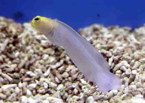 | イエローヘッドジョーフィッシュはメキシコ湾からカリブ海に分布しているアゴアマダイ科の海水魚で、南緯10度辺りのブラジルでも見られる。 体は細長く、頭部は丸みを帯びている。 口は大きく、背びれやしりびれの基底は長く、尾びれの後縁は丸い。 体色は頭部が黄色く、これが英名にもなっているが、各ひれを含め、体は青色や薄い紫色のような色をしている。 水深3~40m程のところに見られ、砂底や細かな砂利底、砕けた珊瑚の混じる砂底などに、縦に伸びる巣穴をつくって生活している。 この巣穴は、小石や貝殻、砕けた珊瑚などを大きな口で運んできて、周囲がよく補強されている。 あまり遊泳することはなく、巣穴の周りでホバリング(立ち泳ぎ)をしていることもあるが、巣穴から頭だけを出していることが多い。 また、雄は孵化するまで口内で卵を守る習性がある。 イエローヘッドジョーフィッシュは食用に利用されることはないが、観賞用に利用されたりする。 |