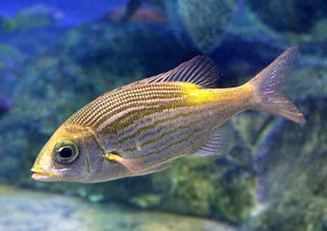 | ノコギリダイはインド洋や西太平洋などに分布しているフエフキダイの仲間で、国内では小笠原や高知・和歌山などより南に分布している。 体は長い楕円形で、側扁している。 吻は短く、頭部の背縁は盛り上がっている。 体色は紫色を帯びたような淡い褐色で、各ひれは淡い赤色をしている。 体側には数本の黄色っぽい縦帯があり、背びれの後端付近の体側背部にも黄色っぽい斑が見られる。 尾びれは深く切れ込み、鰭膜には鱗がある。 また、主上顎骨の側面には鋸歯状の隆起があり、これが名前の由来になっている。 沿岸の浅い岩礁域やサンゴ礁域などに群れで生息し、甲殻類や小魚などを食べる。 しばしば100尾を超える大群になる事もあるが、夜は群れがばられて、それぞれが岩陰など眠る習性がある。 この時、体の黄色は薄れて、暗色のマダラ模様が現れる。 ノコギリダイは刺し網や釣りなどで獲られ、食用魚として流通している。 白身の魚で塩焼きやフライ、刺身などに利用され、美味しいものとされている。 また、幼魚は観賞に利用されることもある。 |